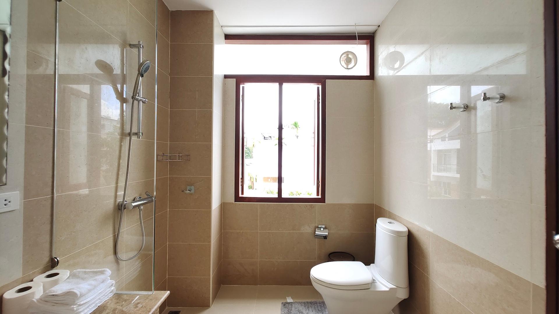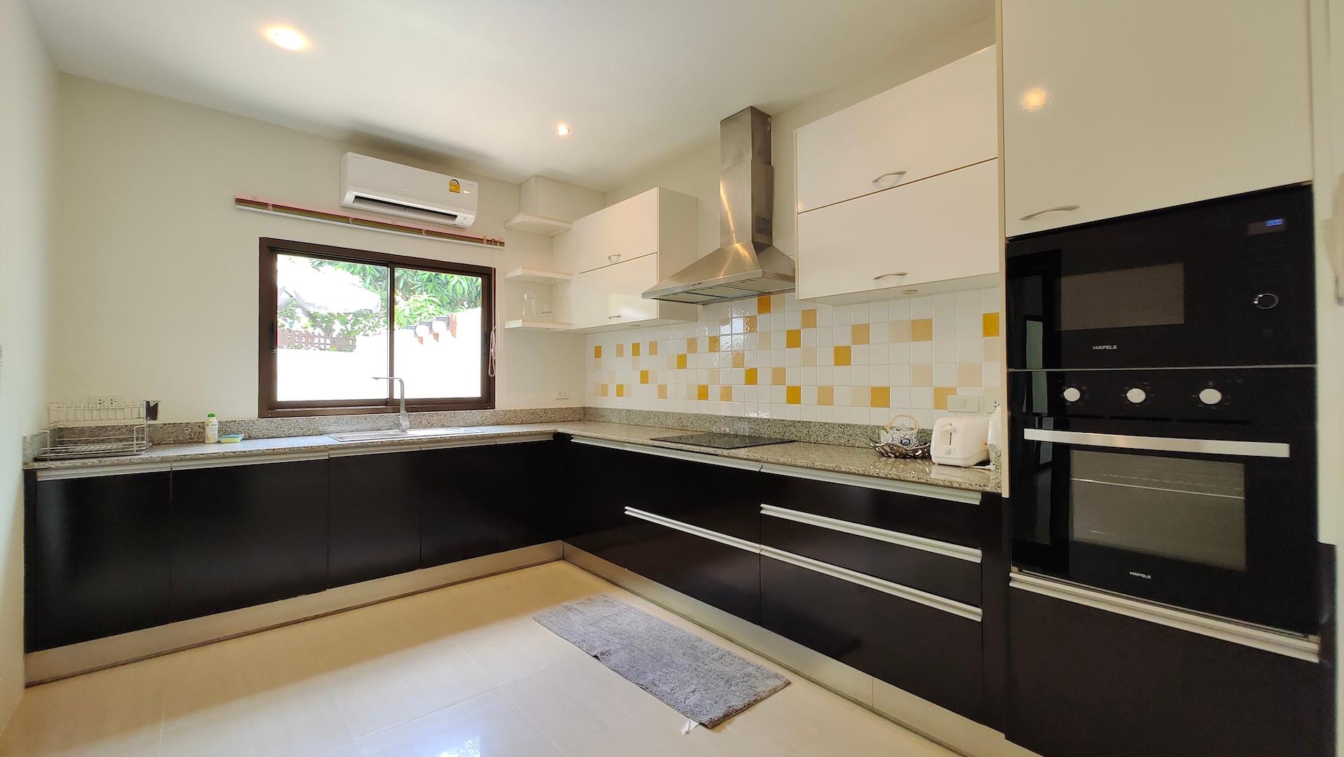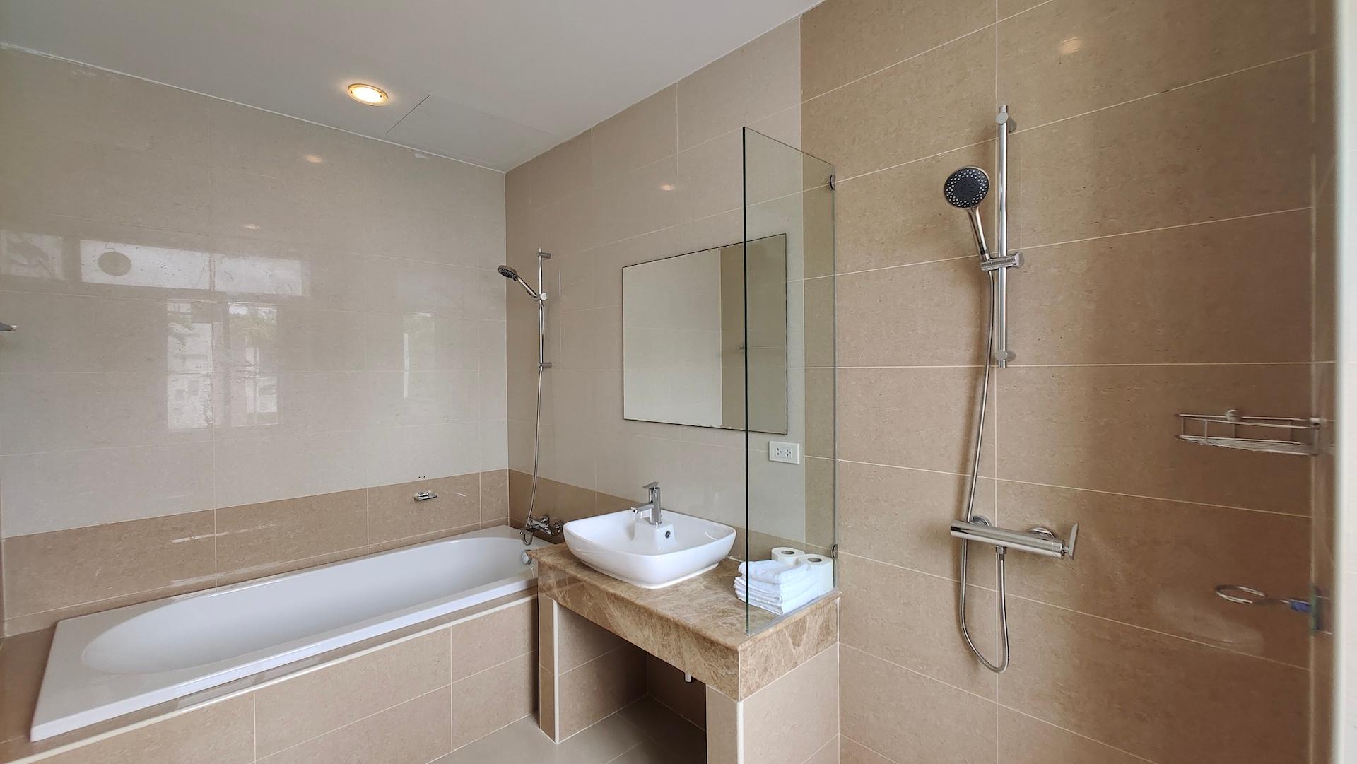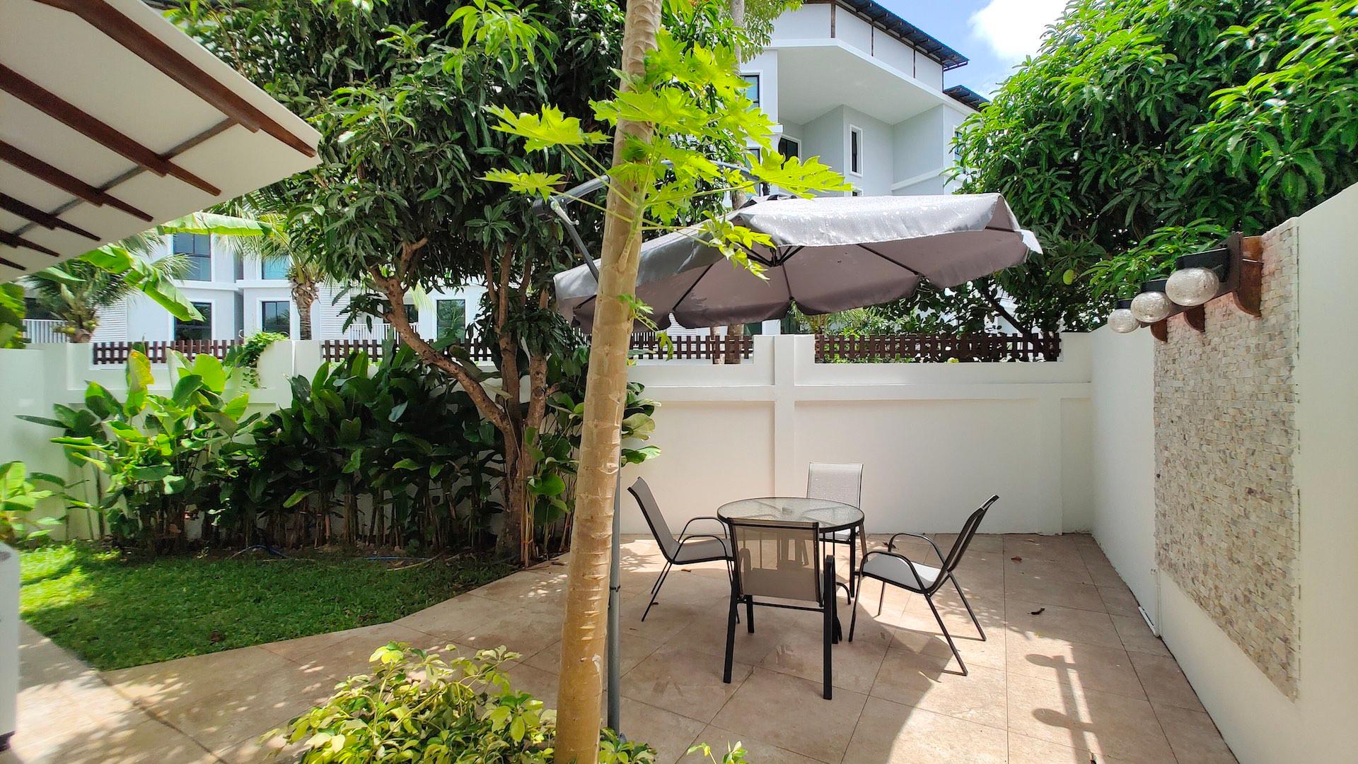 The townhouse has three bedrooms, two bathrooms, one additional toilet, a fully equipped kitchen, a dining area, a lounge area, a private sun terrace. There is a private green yard with an area of about 20 sq.m. The house is located directly next to the communal pool.